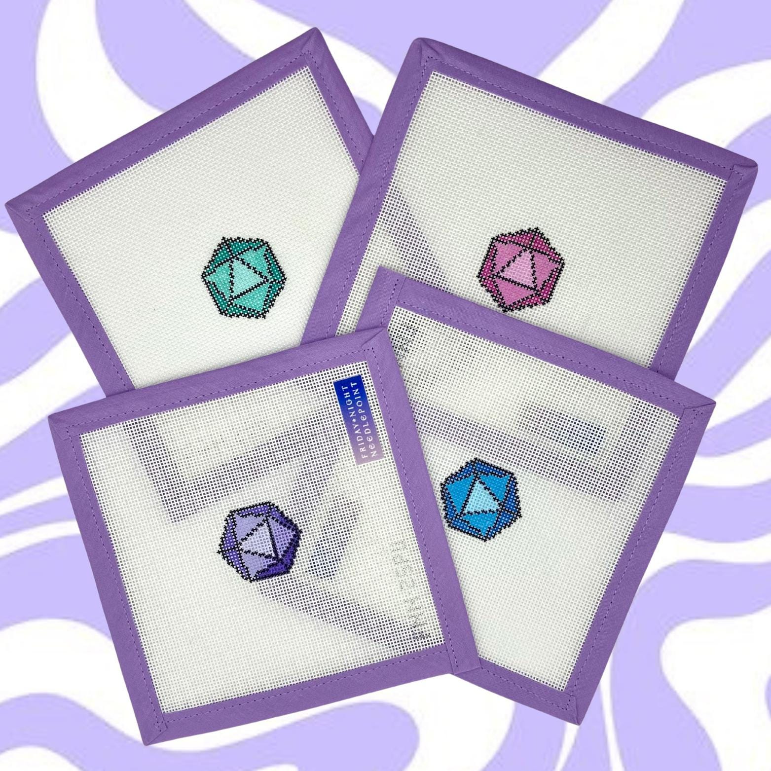 These cute mini canvases are beginner friendly and budget conscience to start your life long needlepoint hobby. These mini canvases feature D20 dice in color variations such as rainbow, purple, pink, and blue. Take your rolls on the go!